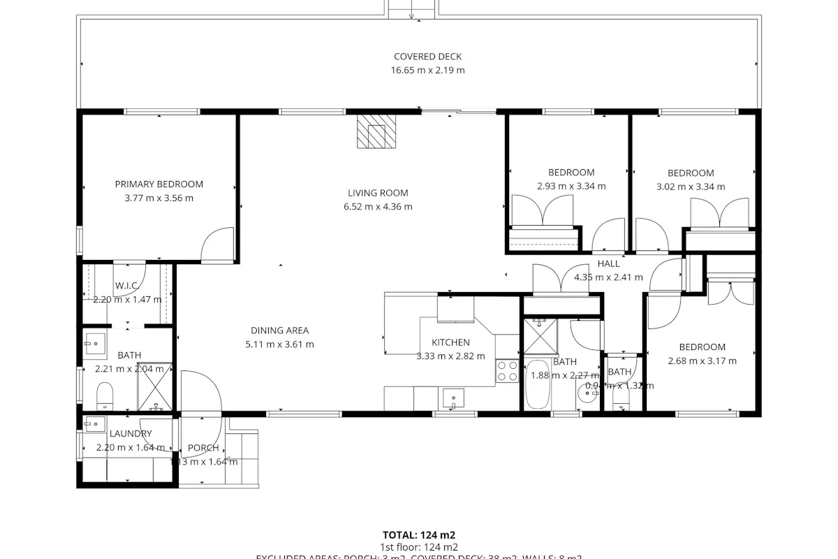 The main bathroom includes a bath, shower, and a well-sized vanity, along with a separate toilet for added convenience.